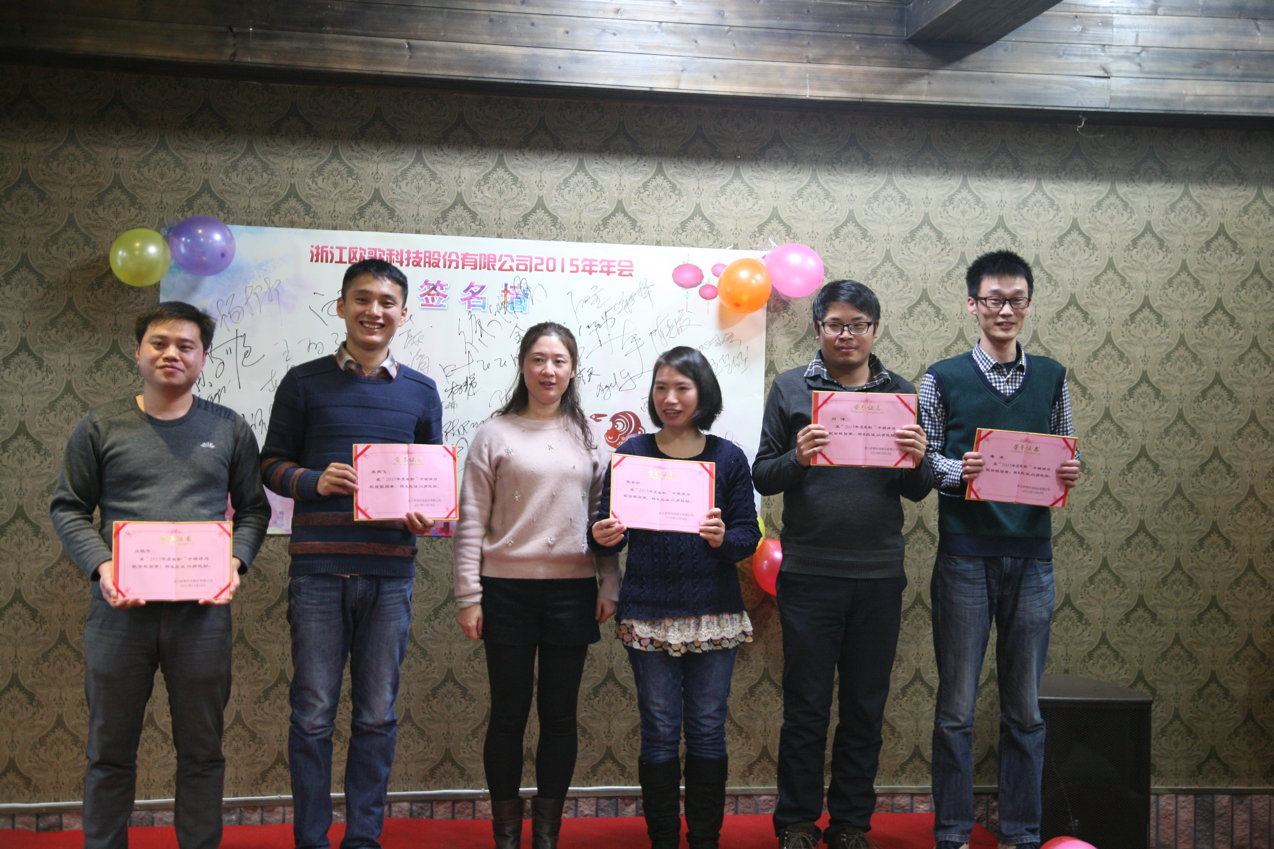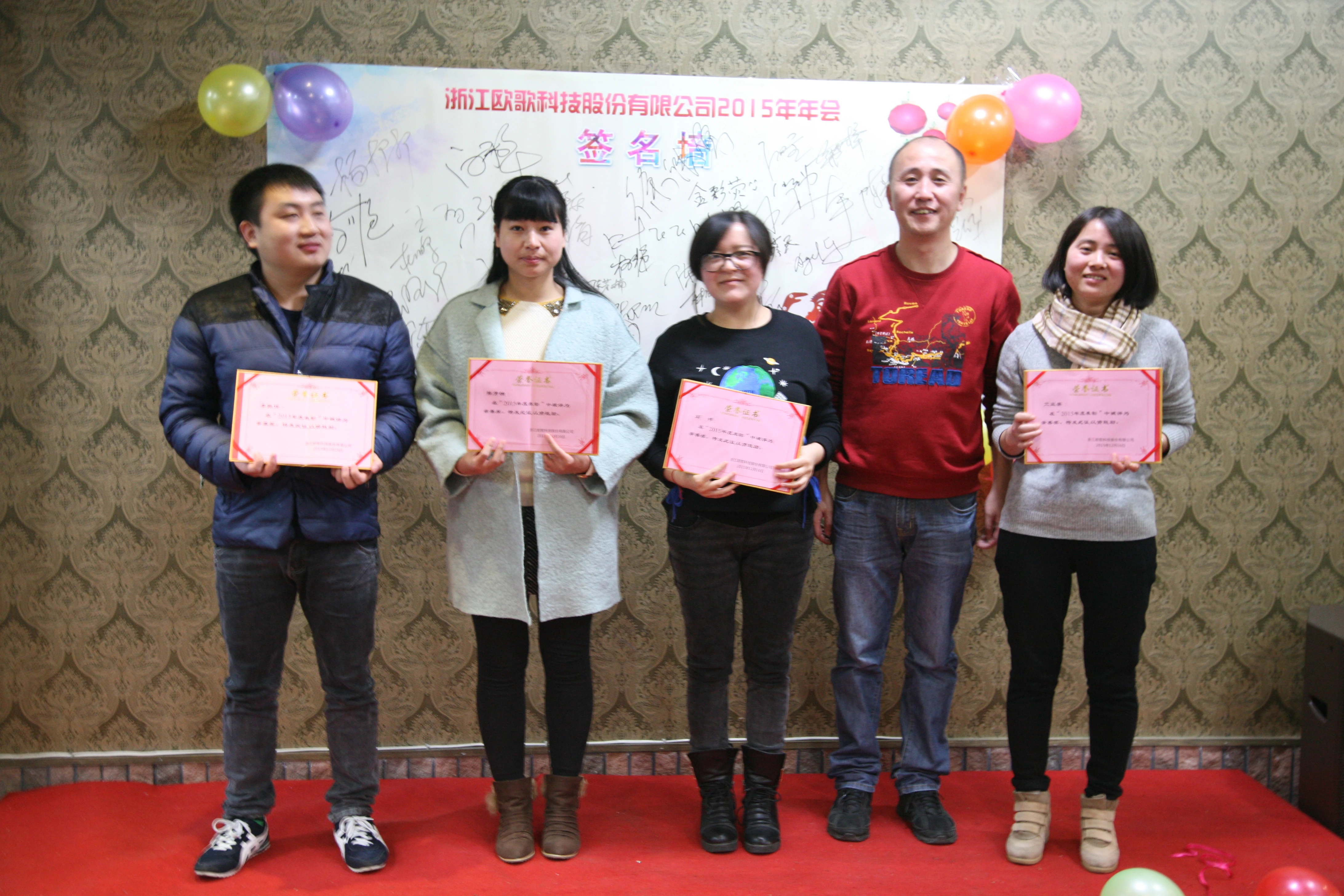 时光荏苒,岁月更迭,恰是阳光明媚时!2015年12月18-19日,浙江欧歌科技股份有限公司全体员工在建德市新安江森林温泉度假酒店举办了2015年年会,欧歌科技董事长韩馨梓女士、总裁陈乃全先生等领导及公司全体员工共同参与了此次年会,全体员工共同度过了一个难忘而欢乐的年会。