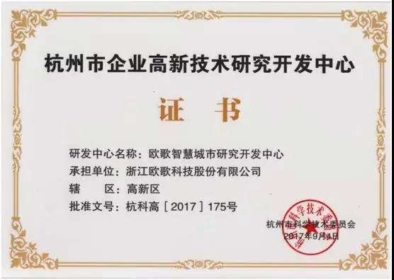 欧歌科技喜获杭州市高新技术研发中心荣誉称号