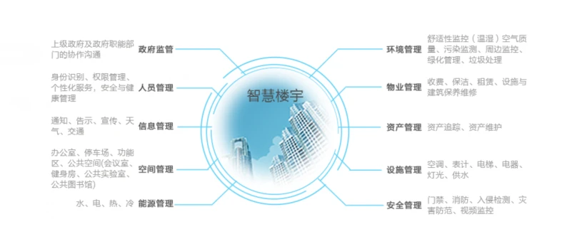 智慧楼宇和园区,就是充分利用新一代物联网信息技术,为人们建设更加绿色、安全、舒适、高效、节能的工作和生活环境,从而建设更加智慧的城市。充分利用物联网技术,为楼宇和园区安装视觉、触觉、嗅觉、温度感知、湿度感知、流量感知、能耗感知等“神经末梢系统”,信息都会实时传递楼宇的“大脑”,即楼宇总控中心,便于对各种情况进行分析和决策并与社区和园区指挥中心、城市指挥中心、公安指挥中心等外部系统进行实时联动。