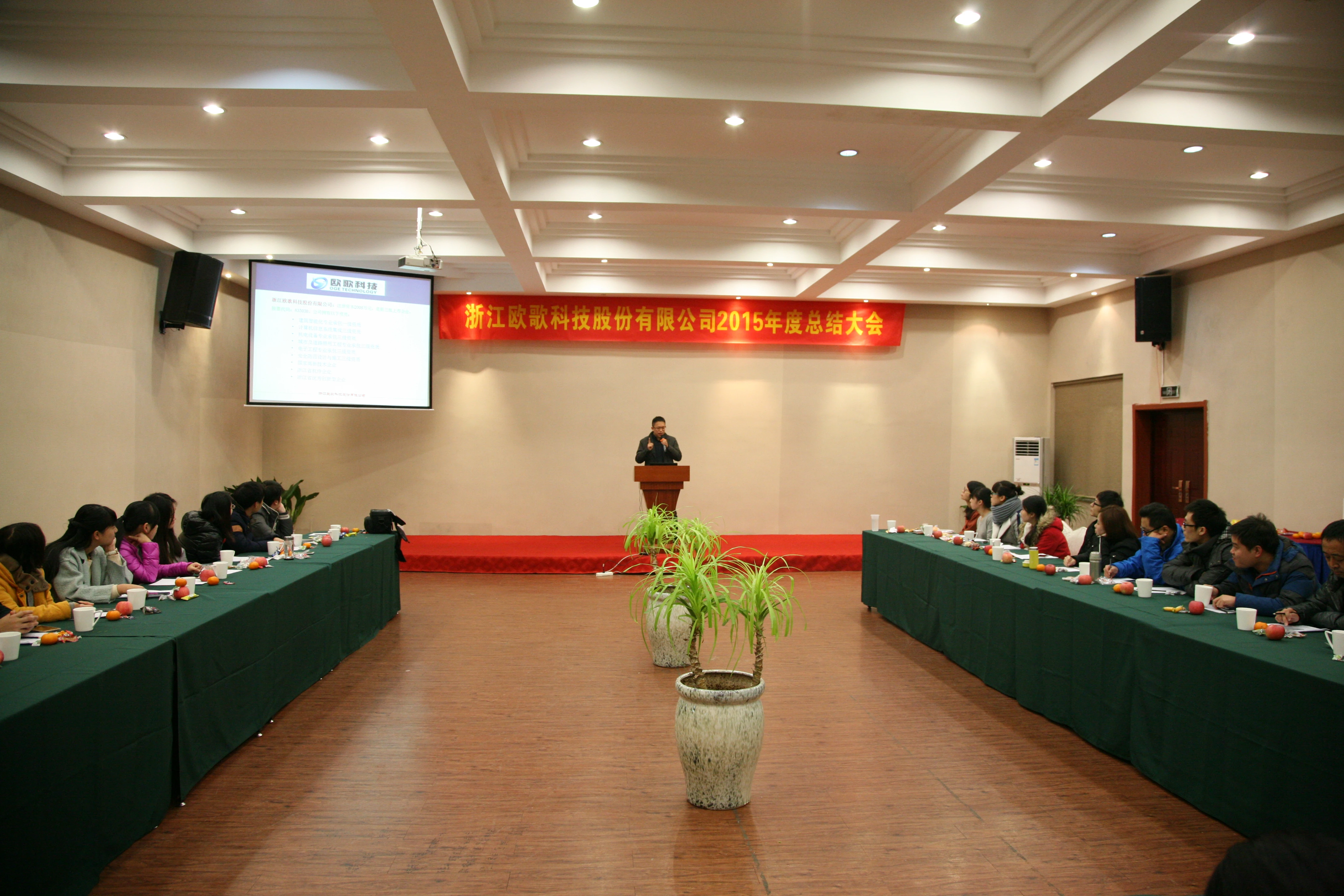 公司对此次年会组织安排三大环节,包括:享受温泉、年会晚宴、年终总结大会。公司组织全体员工泡温泉,让大家感受到辛苦工作的同时也要学会放松自己。晚宴中,公司领导层精心为员工准备的年会奖品,为获奖员工和团队颁发奖杯、证书、及各类丰富奖品,包括行车记录仪、速照照相机、养生壶、煮蛋器、电子脂肪称等,令现场火热沸腾。年度总结大会中,一共包括四个阶段,大会第一阶段是各部门负责人和项目经理做2015年度总结及2016工作计划汇报,内容精彩纷呈,感触良多;大会第二阶段是总裁陈乃全先生作欧歌科技2015年度工作报告,报告中,陈总总结了公司2015年度取得的优异成绩,明确了公司2016年经营的总体规划,包括经营目标、重点工作等;大会第三阶段是董事会秘书孙玉萍女士分享公司新三板挂牌历程;大会第三阶段是董事长韩馨梓女士做重要发言,感谢欧歌科技员工一年来的辛苦工作,表达了对欧歌科技未来发展的期许,也让全体欧歌人内心澎湃、精神振奋。